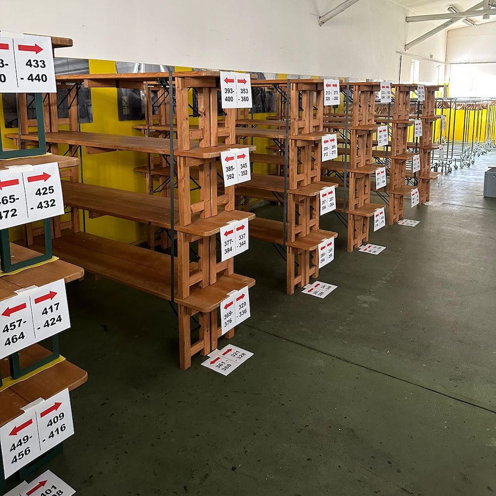 Die Garderobenregale sind vielseitig einsetzbar. Sie bieten Platz für 80 Taschen, Schuhe und ähnliches. Der Preis versteht sich für ein Regal bestehend aus 8 Tischbänken.