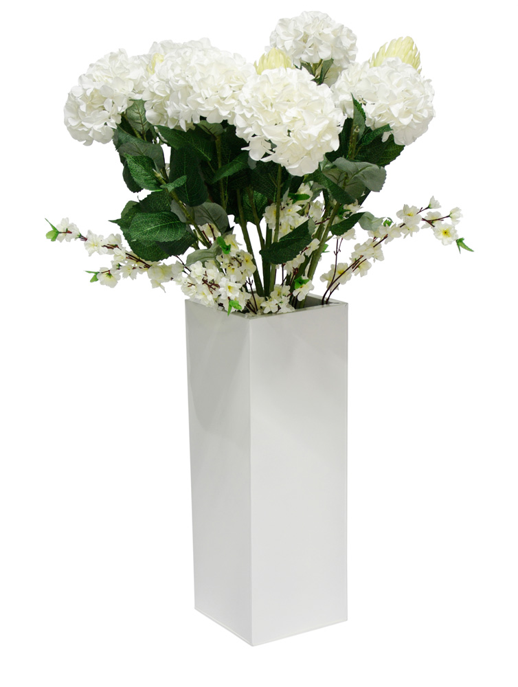 Schönes Kunstblumengesteck in viereckiger Vase. Bestens geeignet für Eingangszenarien, Bühnendekoration und Raumdekorationen.