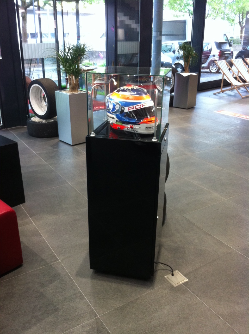 Elegante Haubenvitrine mit schwarzem Unterbau und Beleuchtung von allen Seiten.