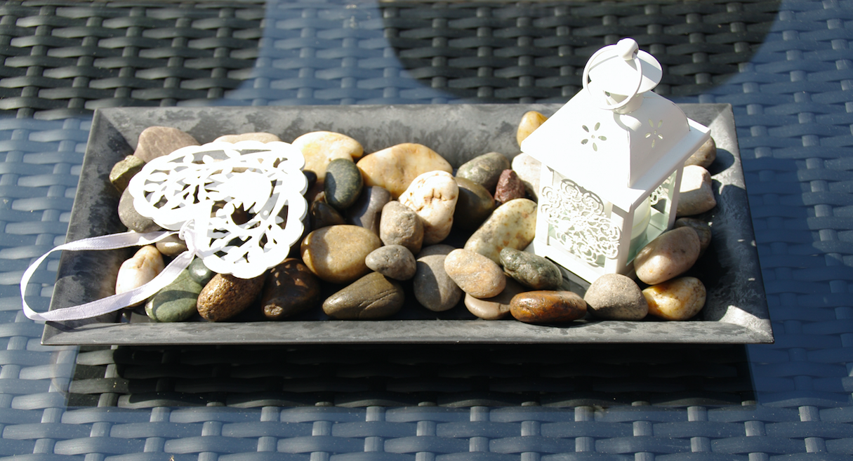 Tischdekoration mit Steinen, weissem Windlicht und weissem Herz auf einer Grundplatte. Besonders geeignet für Outdoordekorationen oder auf Rattan-Lounges.