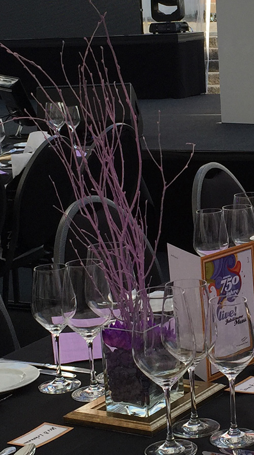Tischdeko mit violettem Strauch