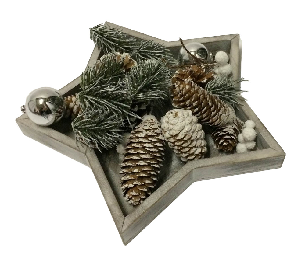 Dieser Holzstern gefüllt mit Tannenzapfen und Weihnachtskugeln lässt einen Tisch in Weihnachtsstimmung erscheinen.