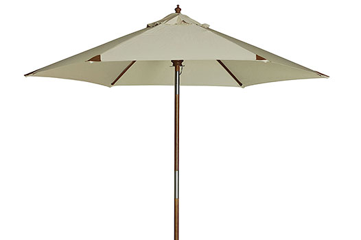 Edler Sonnenschirm mit écru Stoffdach und Holzstange.