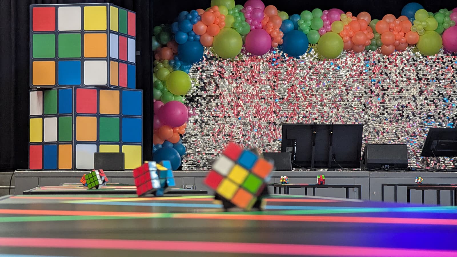 Bringen Sie Nostalgie und Spaß zu jeder Veranstaltung mit diesem riesigen 1×1×1 Meter Rubik’s Cube (inkl. Abhängeset) mit 5 Stoffseiten. Mit einer farbenfrohen Stoffoberfläche und integriertem LED-Licht (die Beleuchtung benötigt einen Stromanschluss), das ein- und ausgeschaltet werden kann, ist er das perfekte Highlight für Partys oder Retro-Events. Er kann aufgehängt oder hingestellt werden, perfekt für Indoor-Events, um eine großartige Atmosphäre zu kreieren.
