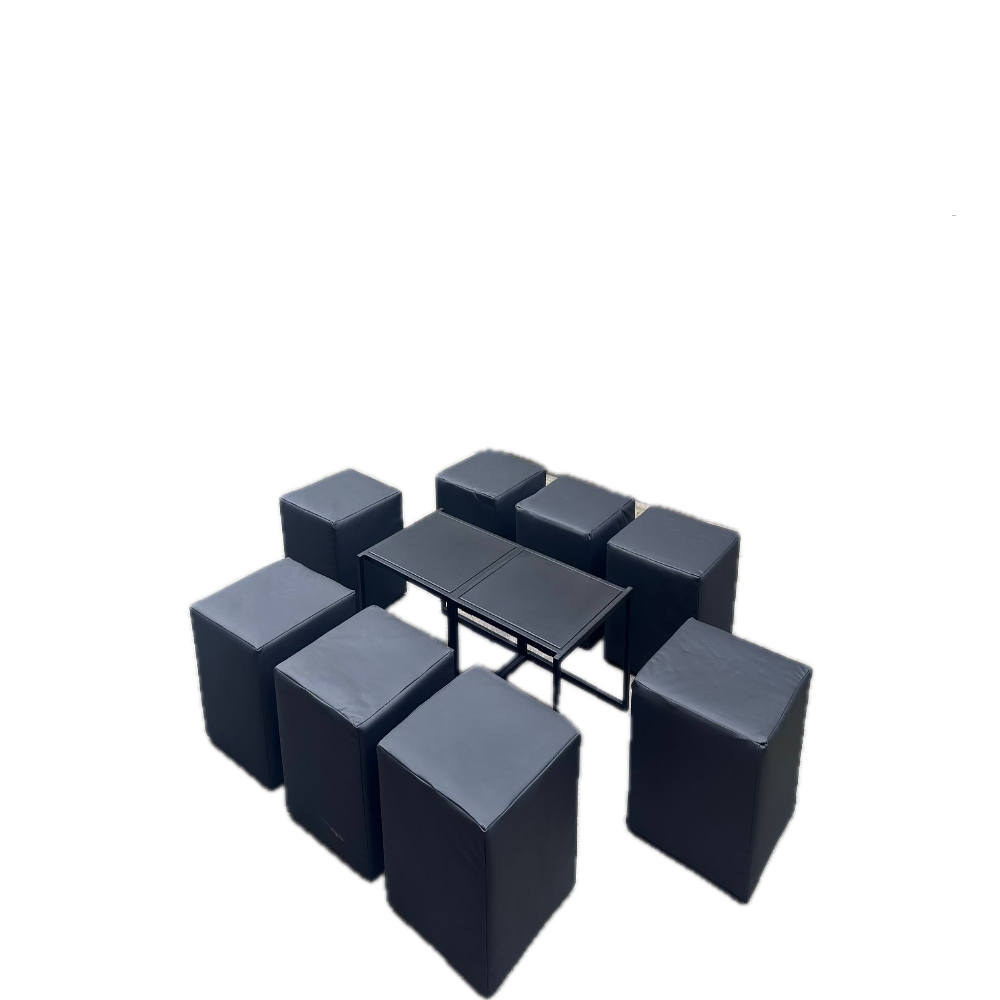 2 x 1er Cubes 40 x 42 x 40 cm auf der breiten Seite, 6 x 1er Cubes 40 x 42 x 40 cm auf der langen Seite und 2x Loungetische 50 x 50 x 40 cm